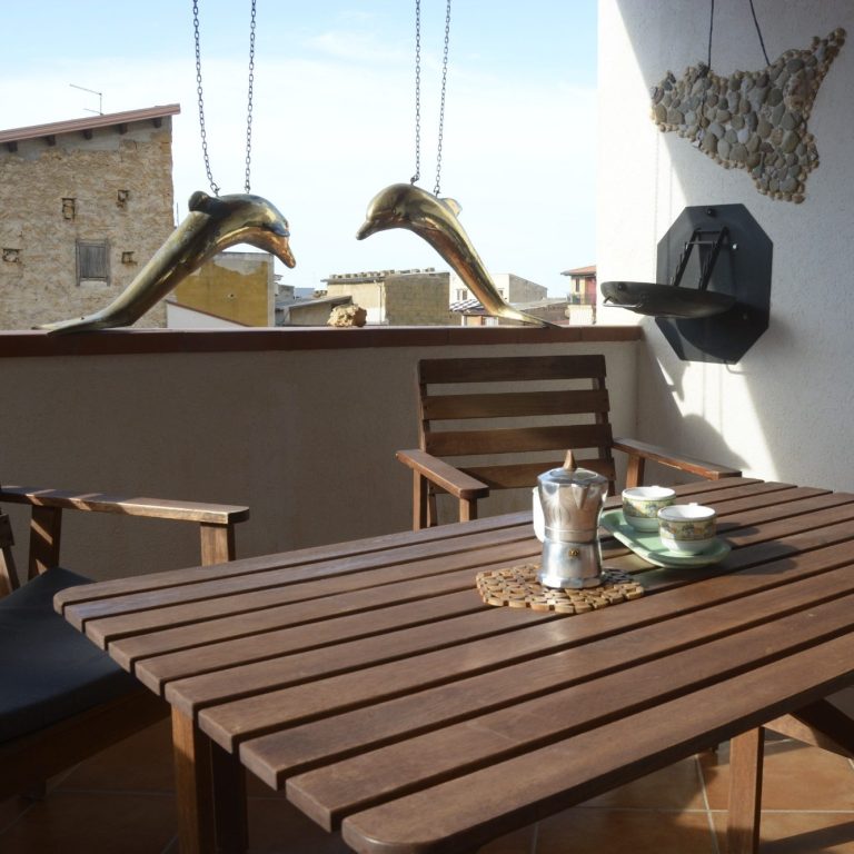 Von der überdachten Terrasse blicken Sie auf einen typischen Innenhof der Altstadt, der zum alten Hafen führt. Ein Holzkohlegrill steht bereit – ideal, um frischen Fisch zu grillen, den der Händler morgens durch die Gassen bringt