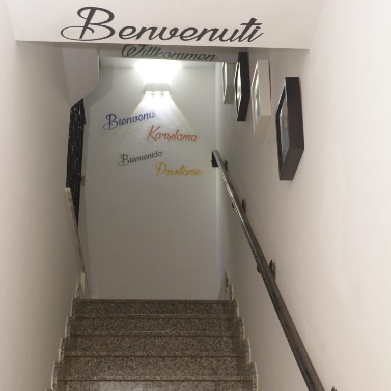Wenn man das Haus betritt und die Treppe hinauf zur Wohnetage steigt, wird man von herzlichen Willkommensgrüßen in vielen Sprachen empfangen – ein kleines Detail mit großer Wirkung.