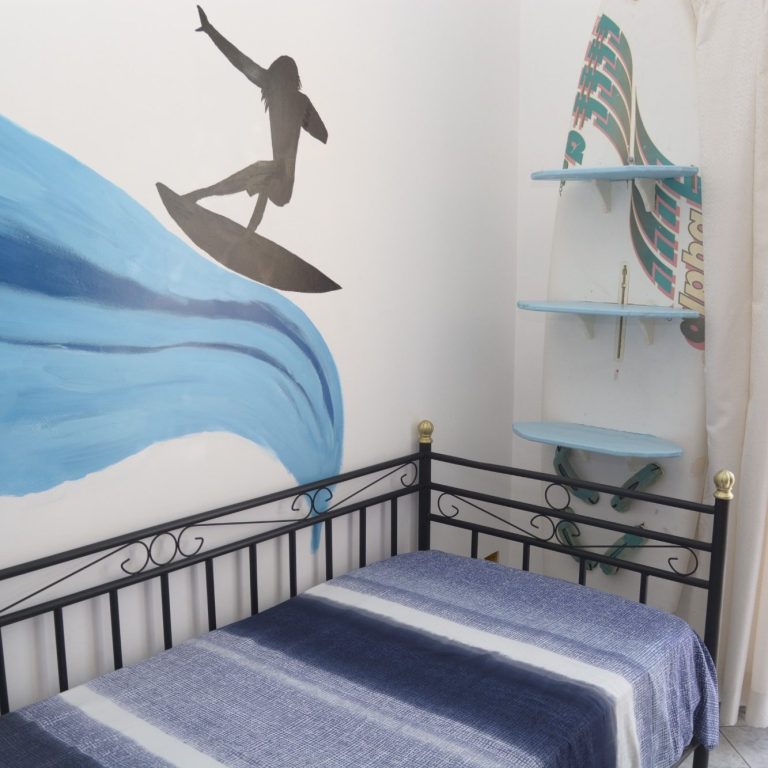 Das Kinderzimmer ist im fröhlichen Surfer-Stil gestaltet – mit maritimen Farben, liebevollen Details und zwei gemütlichen Einzelbetten. Perfekt für kleine Abenteurer, die vom Wellenreiten träumen.